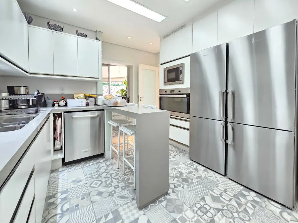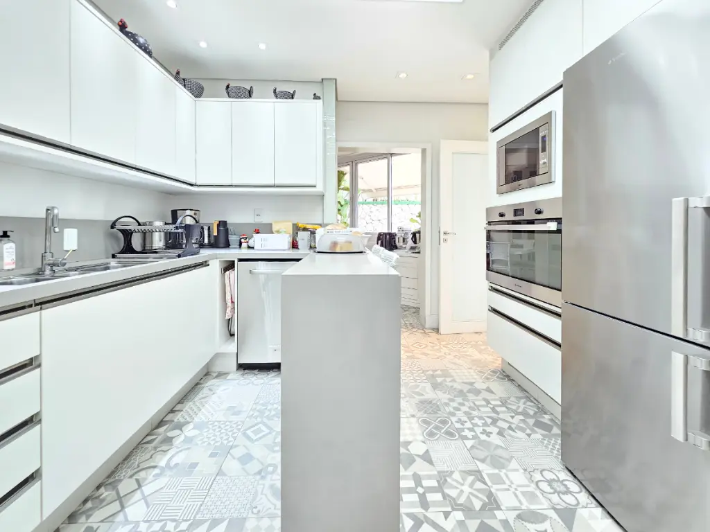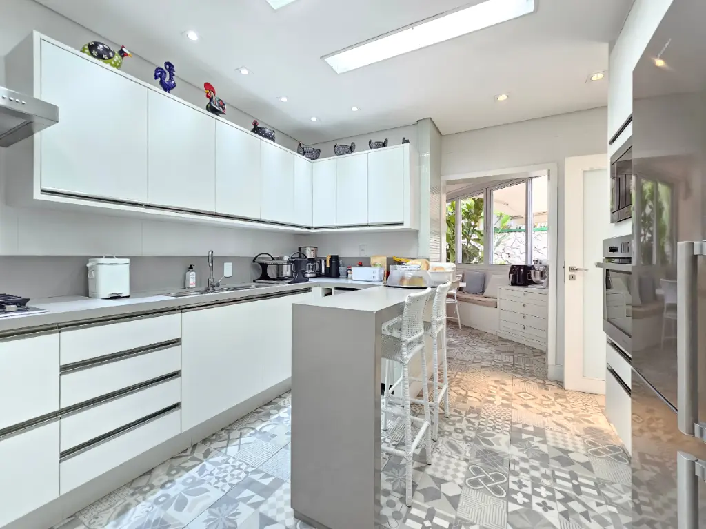 A cozinha é espaçosa, repleta de armários planejados e interligada com a copa (sala de almoço), oferecendo funcionalidade no dia a dia. A lavanderia também possui planejados, facilitando a organização, e há uma despensa prática para mantimentos. A dependência de serviço inclui banheiro completo.