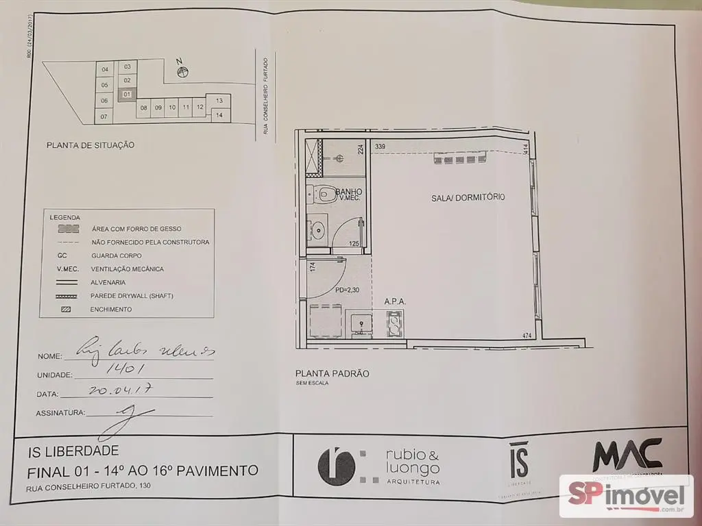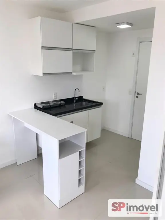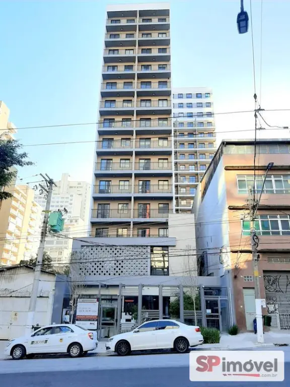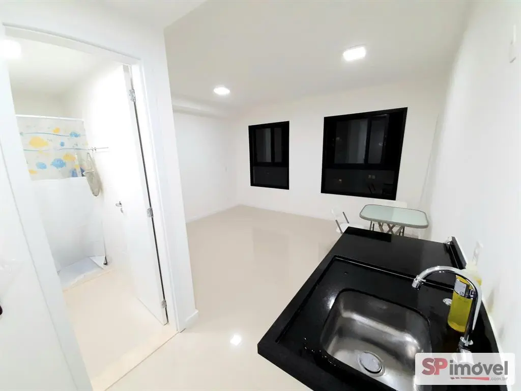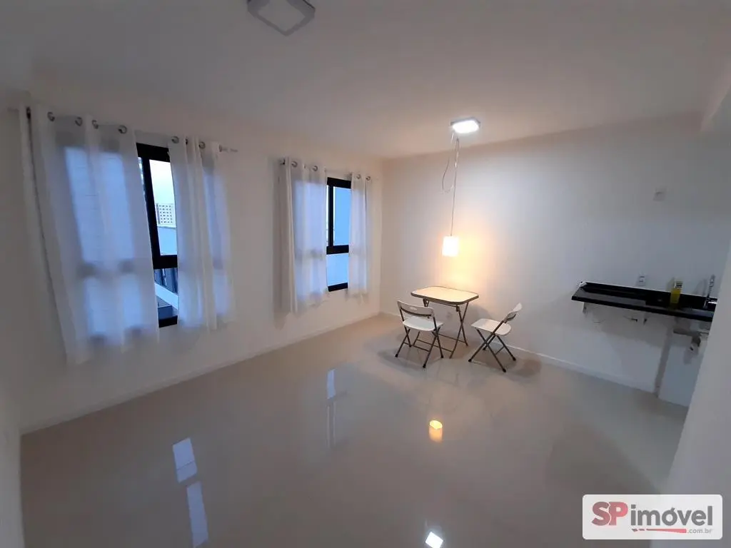 Studio novo, 14° andar, de 24m², sol da manhã com vista livre, geladeira, cama, fogão elétrico, armários de cozinha, guarda-roupas, mesa 3 cadeiras, ar condicionado, tendo 2 janelas, cortinas, etc. Piso em porcelanato, banheiro com armário, box blindex e chuveiro eletrônico.
