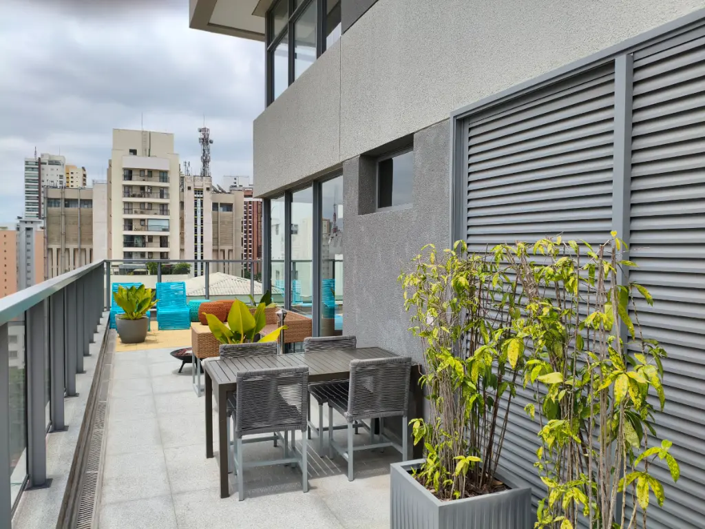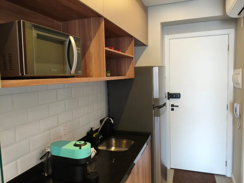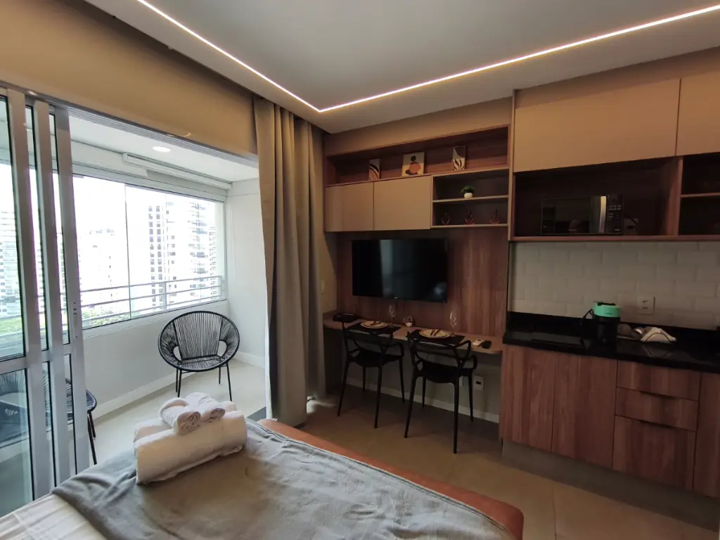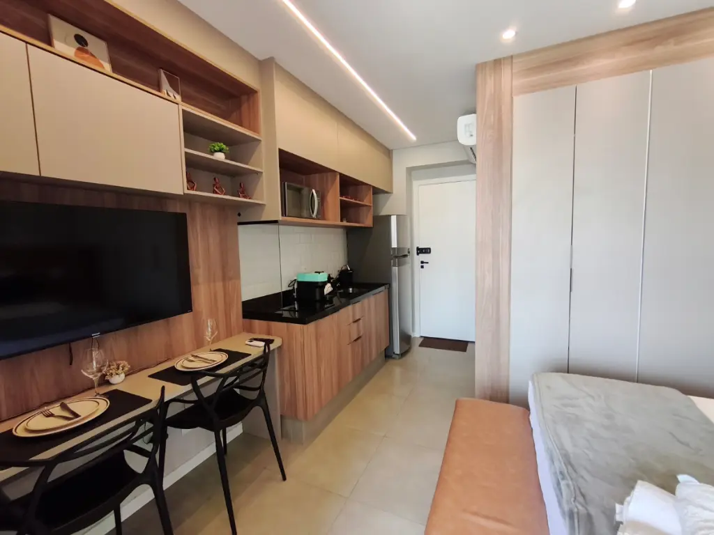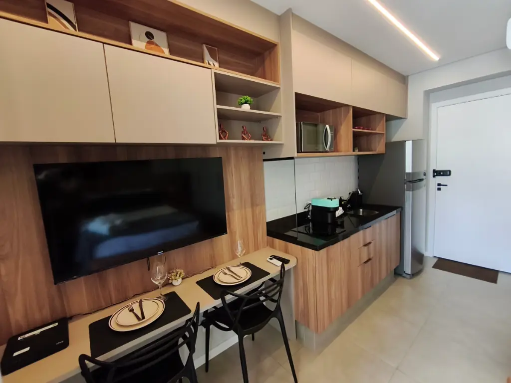 Imagine entrar em casa e ser recebido por um ambiente moderno, planejado nos mínimos detalhes e pronto para morar. Tudo já está no lugar: ar-condicionado para o seu conforto, cozinha completa com armários embutidos, geladeira, cooktop, micro-ondas, além de TV com suporte e persianas blackout para garantir suas melhores noites de descanso.