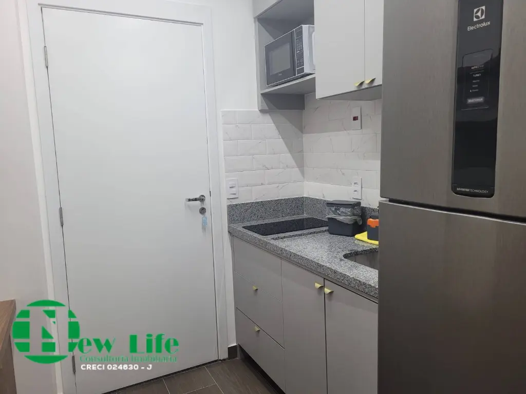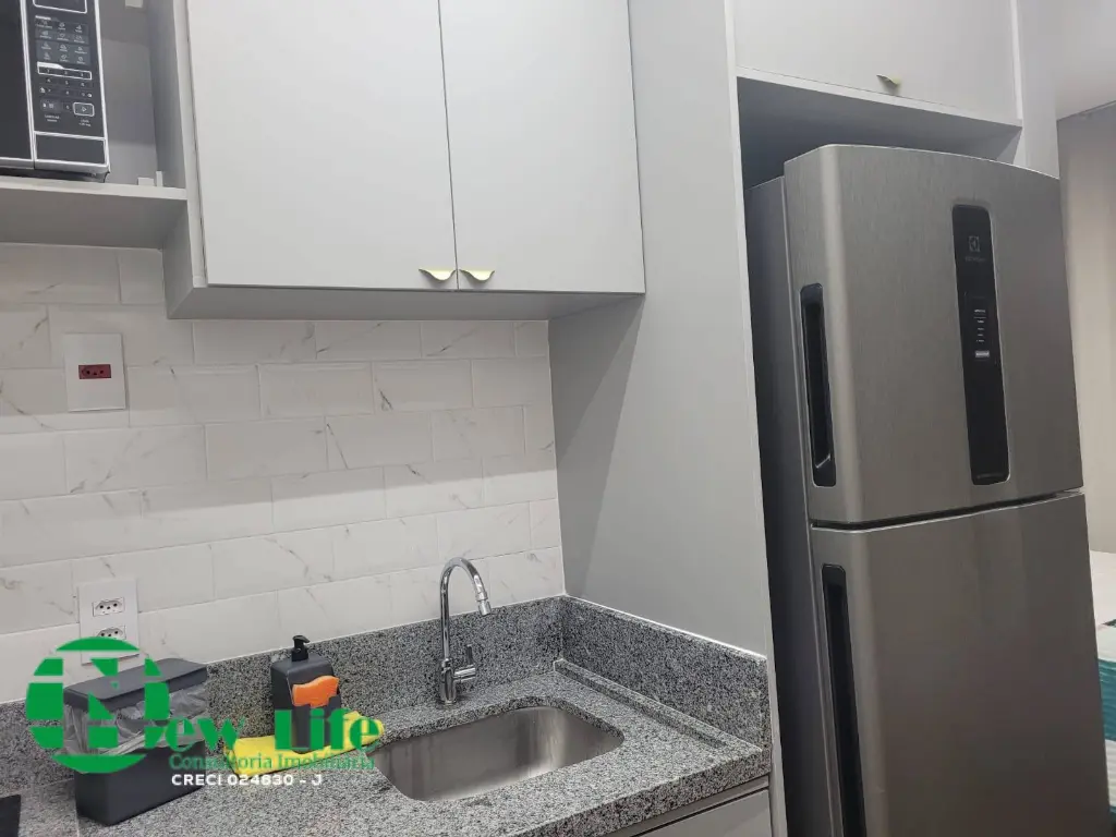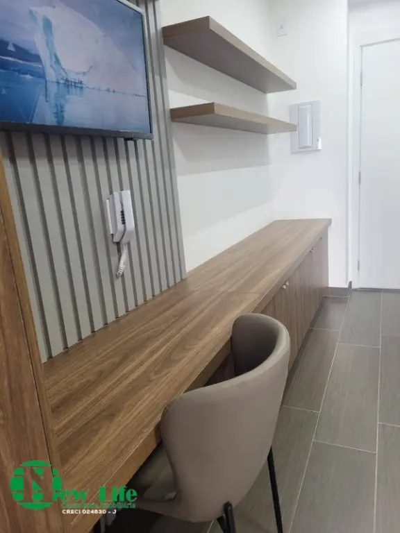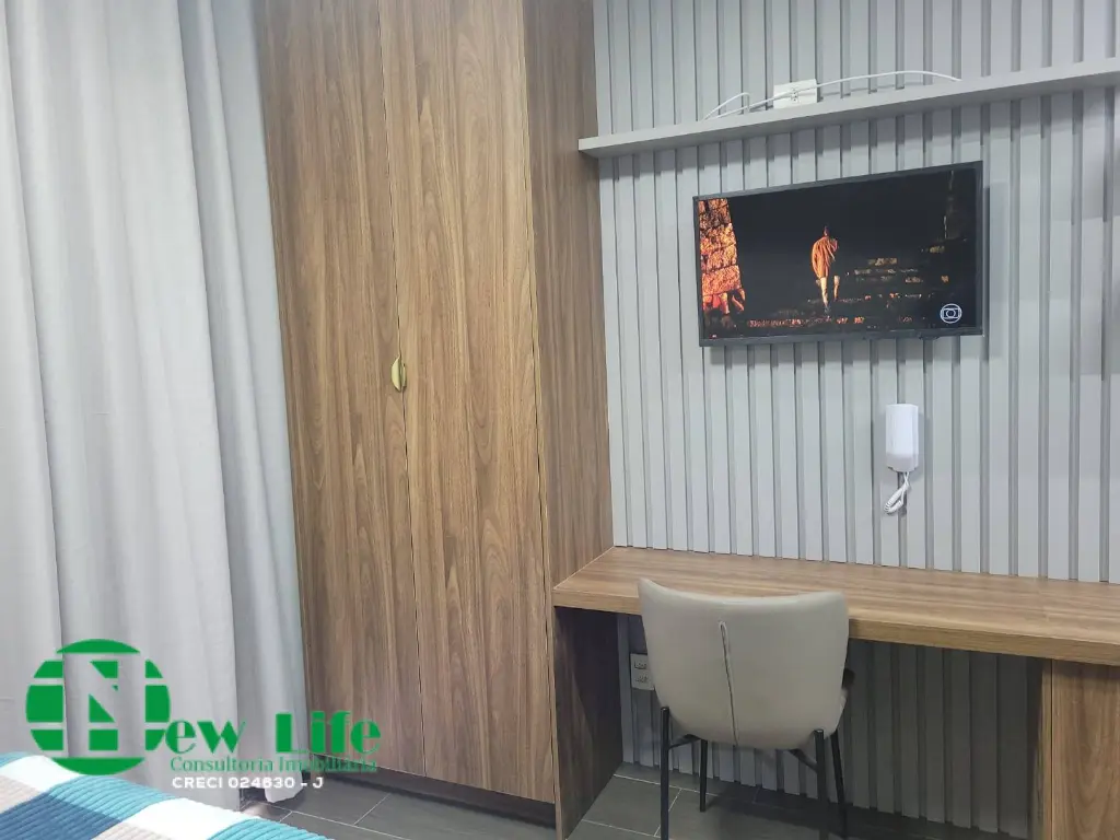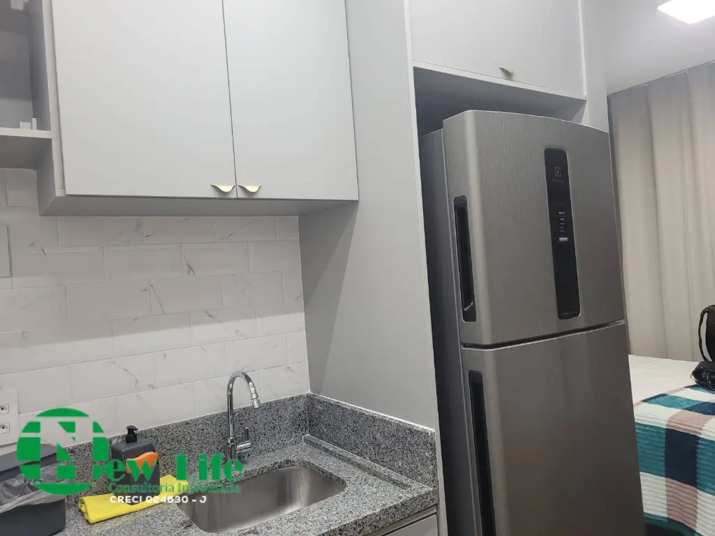 Etudio entregue totalmente mobiliado, nunca foi usado, armarios no quarto, geladeira, ar-condicionado.
