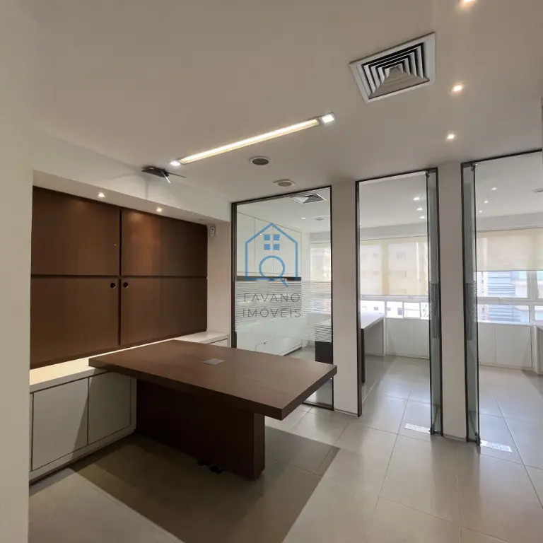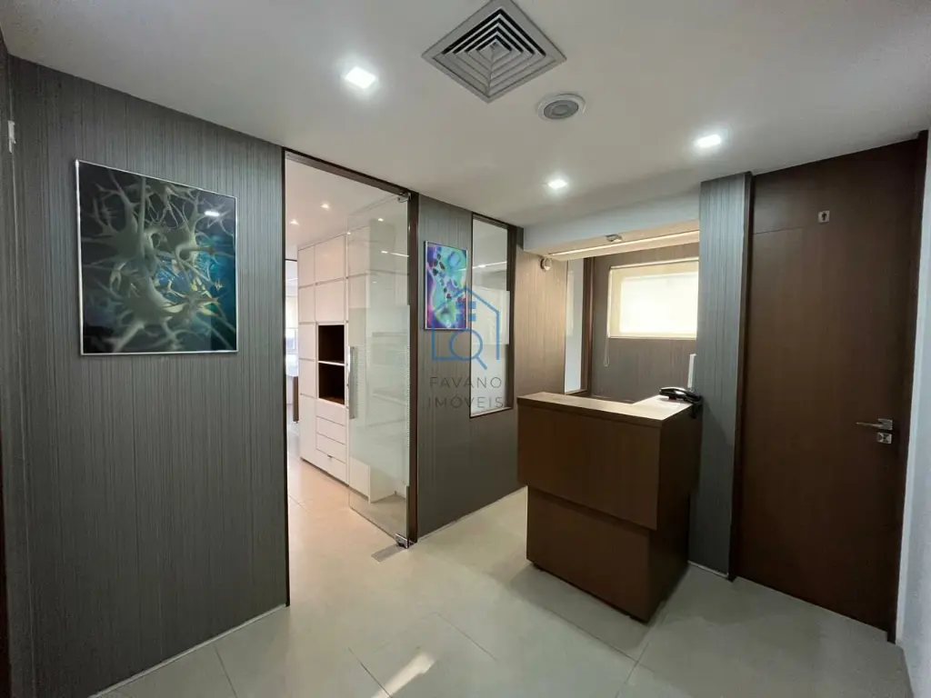 Recepção; Sala administrativo; 2 salas isoladas e independentes; Sala de reunião; Copa; 2 banheiros; Ar-condicionado em todos os ambientes; 2 vagas de garagem.