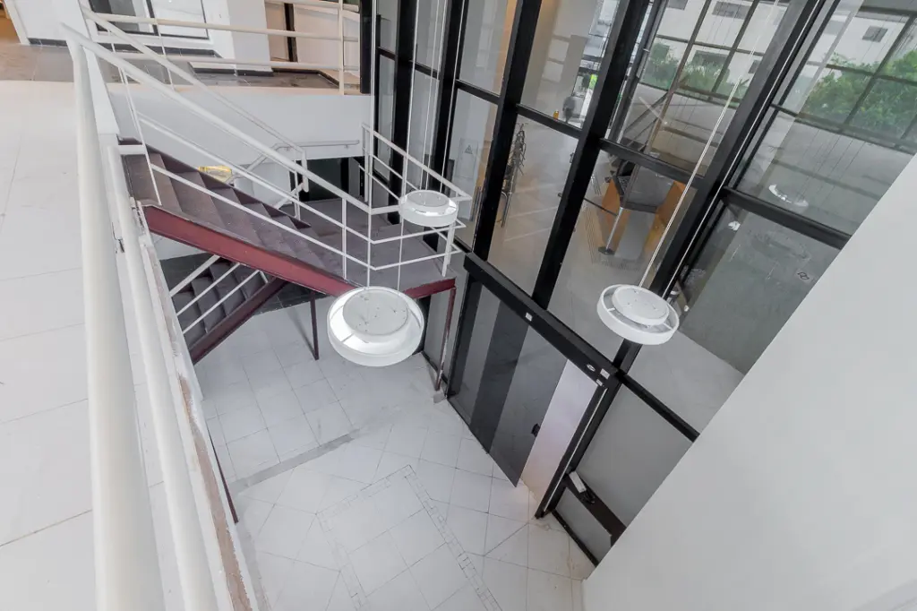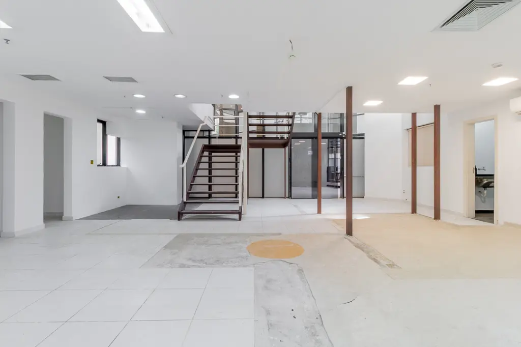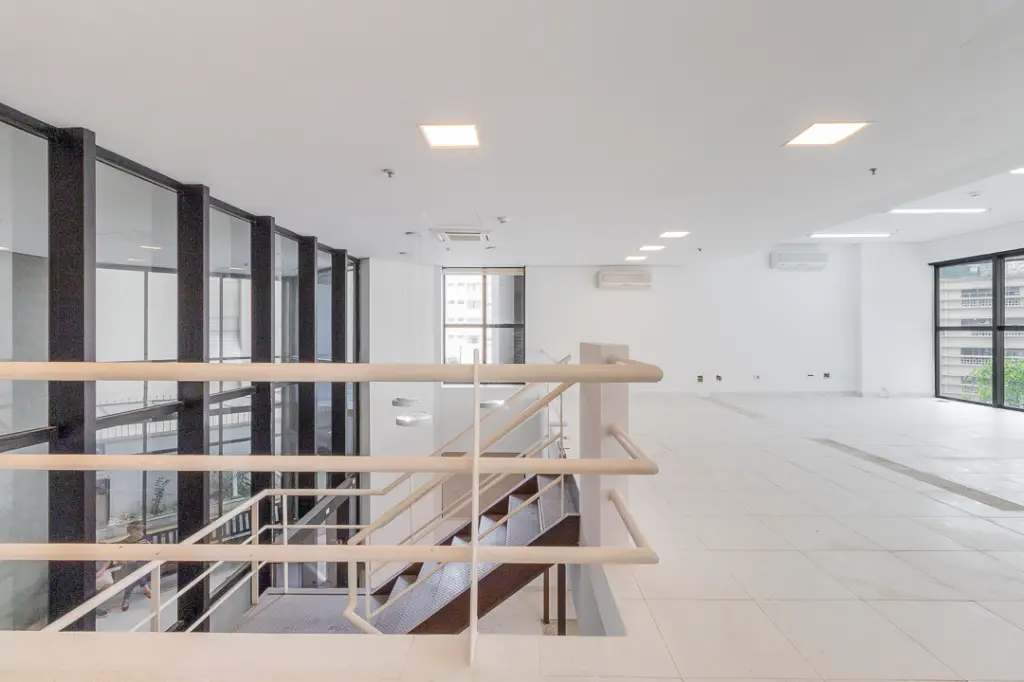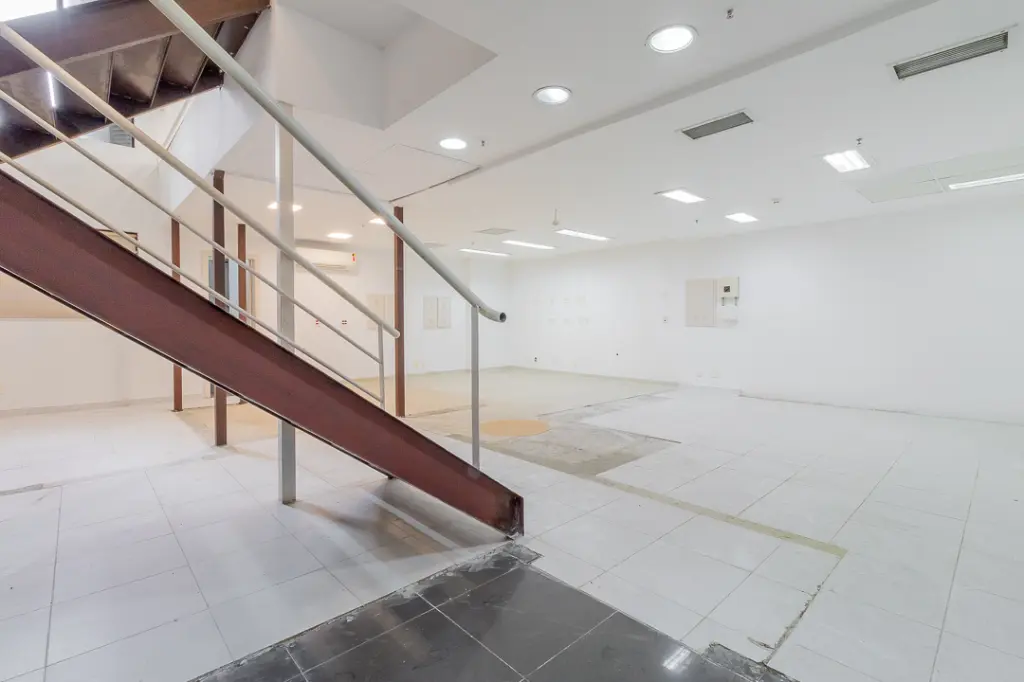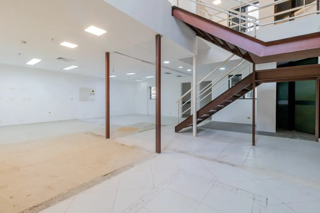 Um dos grandes destaques deste conjunto é o seu andar suplementar em mezanino, que agrega charme, funcionalidade e sofisticação ao ambiente. A integração entre os níveis é feita por uma bela escada, que além de cumprir seu papel funcional, valoriza o projeto arquitetônico e permite a criação de ambientes distintos e complementares, como salas privativas, áreas administrativas ou espaços exclusivos de atendimento.