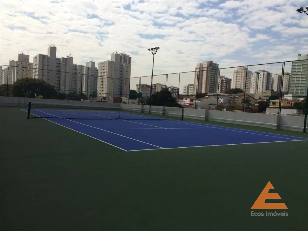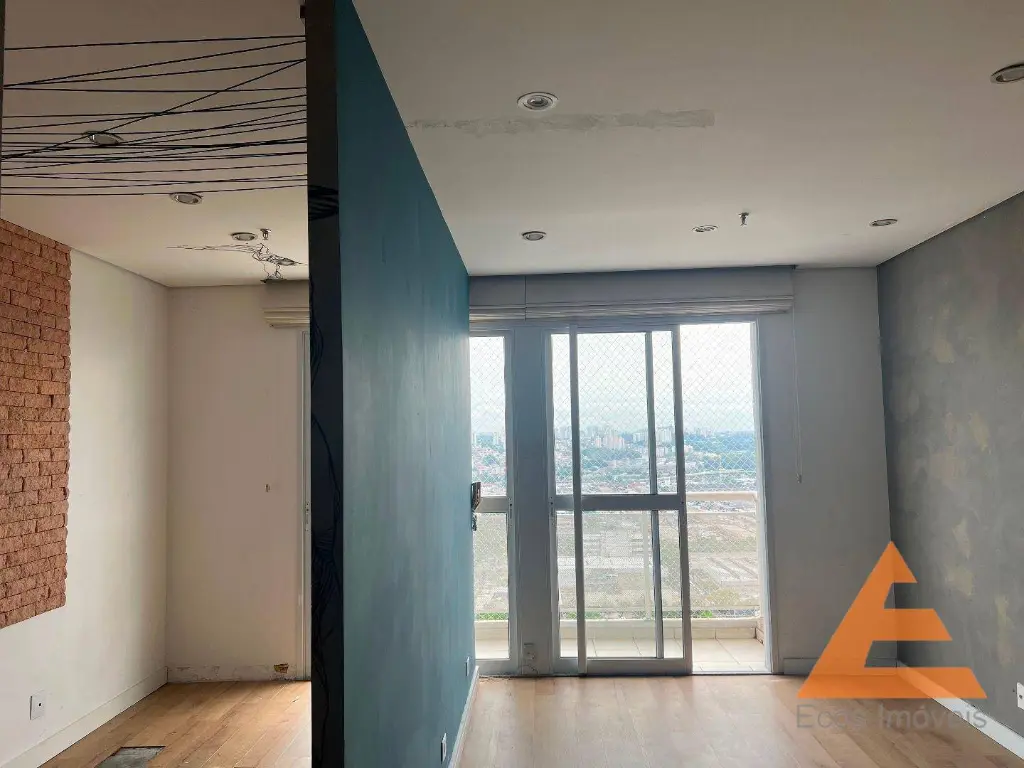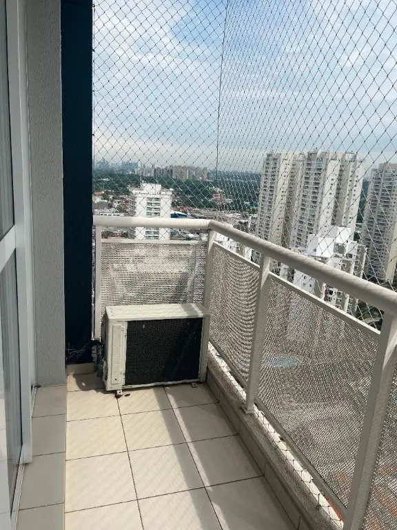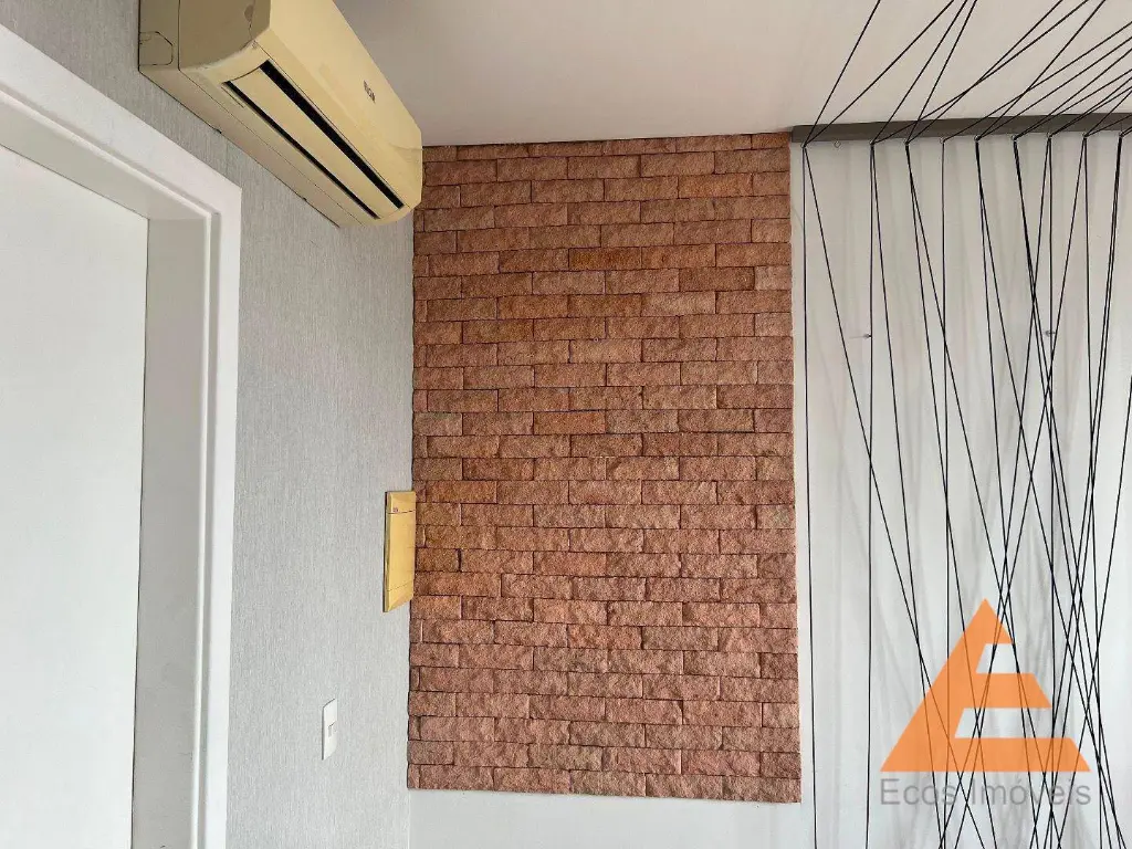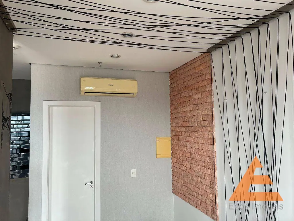Sala com forro de gesso, luminárias, sprinklers e detector de fumaça, piso vinílico, ar condicionado, persianas, rede na varanda.