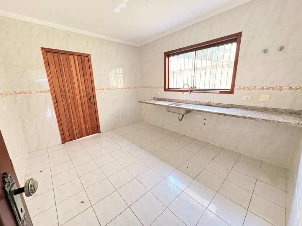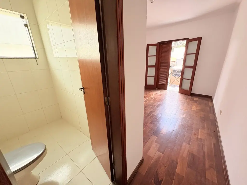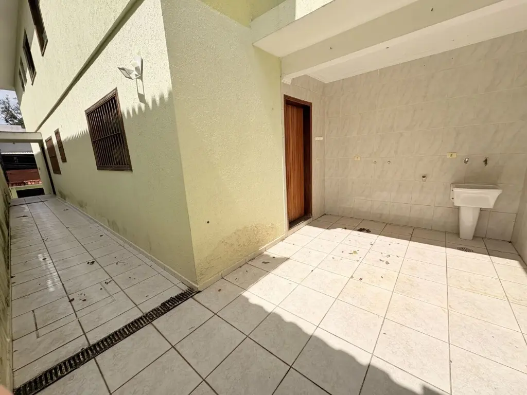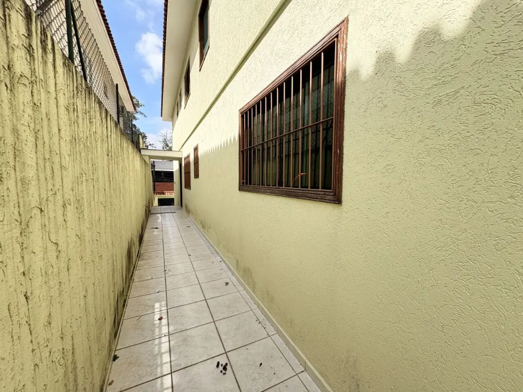 Sobrado com 3 suítes, 1 com varanda, 4 banheiros, salão de festas com banheiro e depósito, área de serviço coberta, corredor na lateral e quintal.