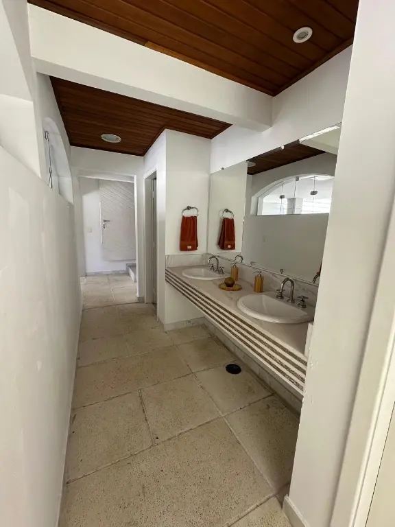 A cozinha gourmet se destaca com forno de pizza e churrasqueira, perfeita para receber amigos e familiares em celebrações memoráveis. Dois vestiários e dois depósitos adicionam funcionalidade ao espaço de convivência, enquanto a lareira traz aconchego à sala de TV, criando o ambiente ideal para noites de cinema. A sala de jantar e a copa completam o layout, oferecendo ambientes elegantes para refeições formais ou informais.